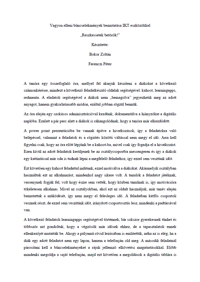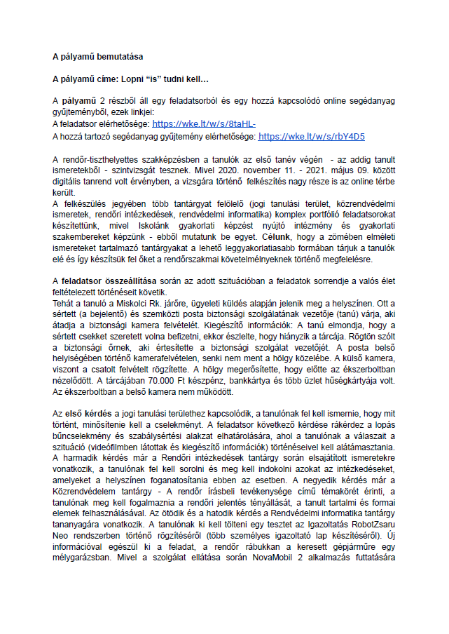A pályázatnak tartalmaznia kellett egy rendészeti vagy rendvédelmi szaktárgy IKT eszközök alkalmazásával vagy annak támogatásával megtartott órájának vagy foglalkozásának bemutatását, amelyben a digitális technika alkalmazásával segítik a tanulókat ismereteik, szaktudásuk bővítésében, képességeik és készségeik fejlesztésében.